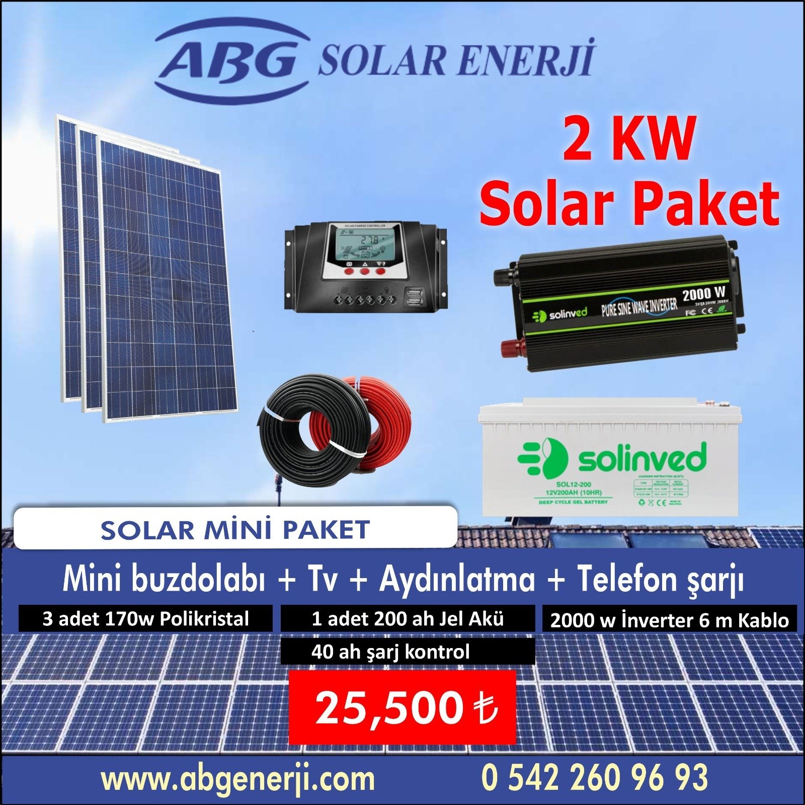 3 ADET 170W POLİKRİSTAL+1 ADET 200 AH JEL AKÜ+ 2000W İNVERTER 6 M KABLO+ 40 AH ŞARJ KONTROL